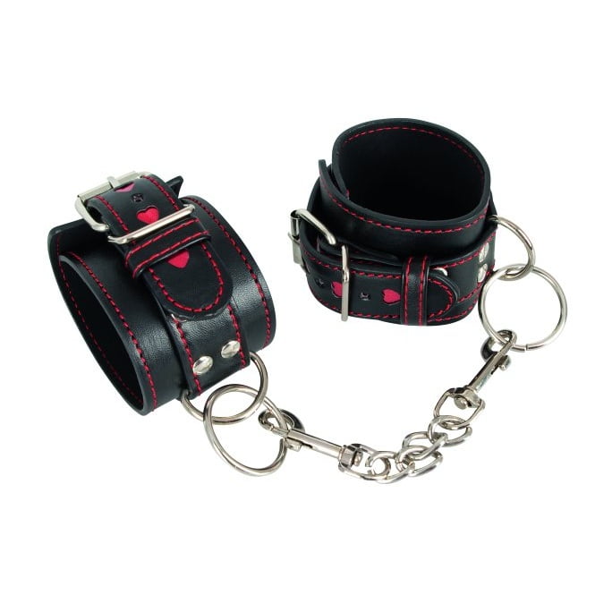 Tato černá pouta s koženým vzhledem se stříbrnými druky jsou skvělým pomocníkem při vašich erotických hrátkách. Drsný vzhled pout zjemňují malá lesklá červená srdíčka a červené prošívání. Díky nastavitelnému zapínání se hodí pro každé zápěstí. Vnitřek pout je vyroben z hladkého semišového materiálu pro příjemnější pocit při nošení. 15 cm dlouhý řetízek je opatřen z každé strany karabinkou. Budete spoutáni nebo se necháte spoutat? To už je jen na vás. Zlobí Vás Vaše polovička v posteli? Ukažte ji svou dominanci i s dalšími produkty značky BAD KITTY zde.