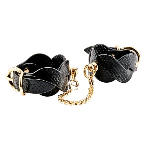 Tato půvabná pouta na kotníky v černém designu jsou vyrobena z veganské imitace kůže, která je flexibilní, příjemná na dotek a šetrná k lidské pokožce. Navíc je měkká pro ještě výraznější komfort a zaujme ještěřím motivem. Pouta jsou smyslně propletena do atraktivního vzoru, jež je doplněn zlatými kovovými prvky, které dodávají celku rafinovaný lesk a výjimečný estetický dojem. Klasická přezka zajistí nastavitelnou velikost, aby perfektně padla každému. Můžete je nosit jako módní doplněk k vašemu oblečení, nebo využít jejich funkčnost a popustit uzdu fantazii. Díky pevnému řetízku z odolného kovu na dvou karabinách omezíte volný pohyb vašeho suba a okořeníte vaši noční bondage vášeň.