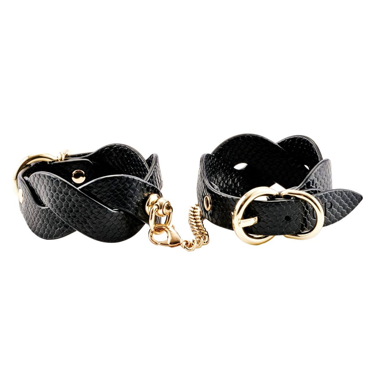 Tato půvabná pouta na zápěstí v černém designu jsou vyrobena z veganské imitace kůže, která je flexibilní, příjemná na dotek a šetrná k lidské pokožce. Navíc je měkká pro ještě výraznější komfort a zaujme ještěřím motivem. Pouta jsou smyslně propletena do atraktivního vzoru, jež je doplněn zlatými kovovými prvky, které dodávají celku rafinovaný lesk a výjimečný estetický dojem. Klasická přezka zajistí nastavitelnou velikost, aby perfektně padla každému. Můžete je nosit jako módní doplněk k vašemu oblečení, nebo využít jejich funkčnost a popustit uzdu fantazii. Díky pevnému řetízku z odolného kovu na dvou karabinách omezíte volný pohyb vašeho suba a okořeníte vaši noční bondage vášeň.