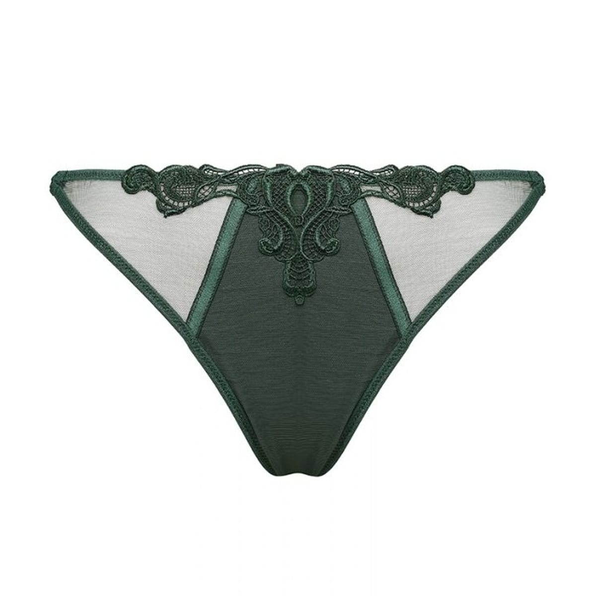 Jedinečná tanga Ewa Bien Lea C202 v originální tmavě zelené barvě vás okouzlí již na první pohled. Jsou ušita z hedvábně jemného a sametově hebkého tylu prvotřídní kvality, který pohladí vaši pokožku s neuvěřitelnou něžností. Navíc probudí fantazii vašeho protějšku, jelikož mají na bocích průhledné průstřihy a nechají nahlédnout pod pokličku. Tkanina je také výrazně pružná, perfektně se přizpůsobí křivkám a skvěle obepne vaše tělo. Ke všemu na přední i zadní části naleznete skvostný ozdobný prvek z krajkové výšivky, který jim dodá fantastický šmrnc. Mají úžasný moderní střih s vykrojeným předním panelem, který je podšitý saténovou látkou, čímž se stane neprůsvitným a přiznané přechody mezi jednotlivými materiály díky tenkým proužkům vytváří půvabný vzor, který působí vskutku nádherně. Zdvojené elastické proužky kolem pasu na zlatých kovových kroužcích vypadají na těle přímo famózně. Rozhodně v nich vynikne váš zadeček, který se tak stane naprosto k nakousnutí a bude magneticky přitahovat pozornost. Tanga mají lemy z tenkých gumiček, které je báječně udrží na svém místě a postarají se o váš maximální komfort při nošení. Mrkněte na další skvostné kousky této značky, které najdete zde.